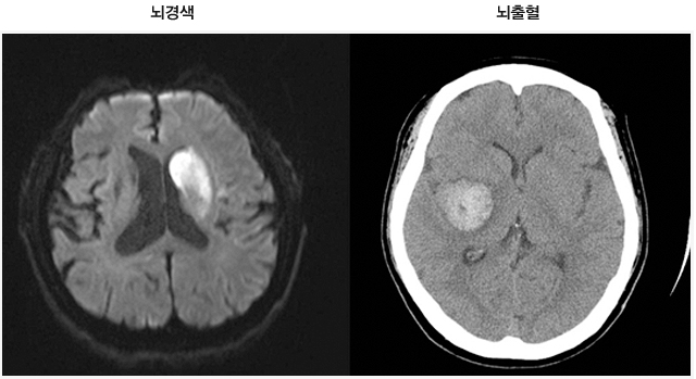 CT 검사는 뇌경색과 뇌출혈을 구분하고 특히 뇌출혈을 빠르게 감별 진단할 수 있다. 단, 뇌경색의 경우 일정 시간이 지나야 병변이 보이기 때문에 초기에 CT 검사로 진단하기 어렵고, 뇌출혈은 출혈 발생 후 CT에 바로 나타나기 때문에 뇌출혈 진단에 유용하다.