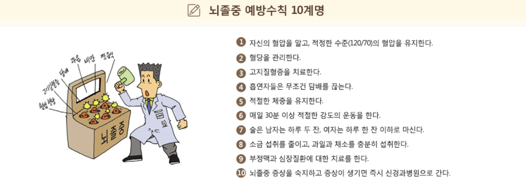 8) 운동부족: 운동을 안 하는 사람은 운동을 하는 사람에 비해 2.7배의 뇌졸중 발생률을 보인다. 운동량과 운동시간이 많을수록 뇌졸중 발생률이 감소하는 경향을 보인다.