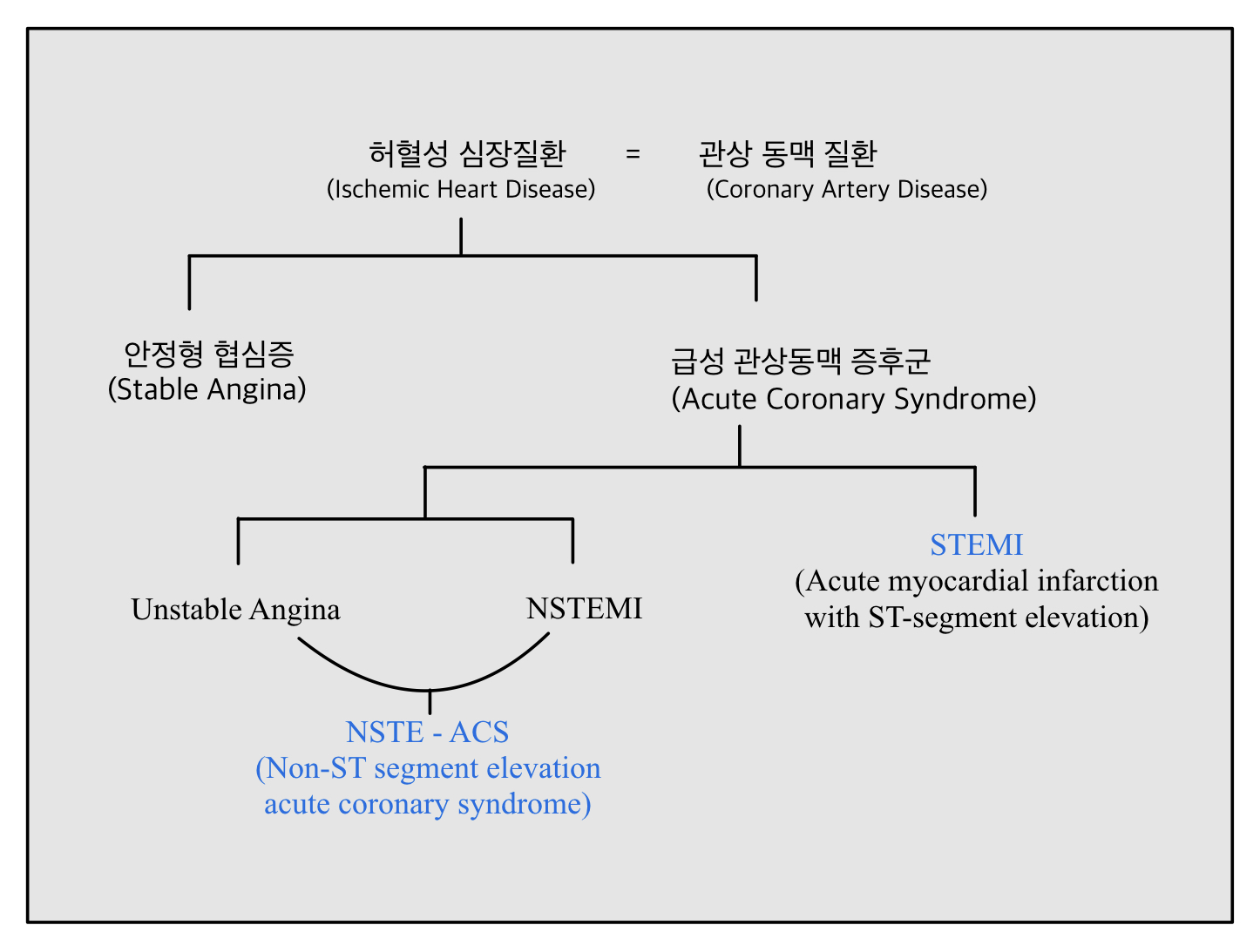 불안정형 협심증은 관상동맥이 동맥경화, 혈전등으로 상당히 좁아진 상태로 흉통이 길게 지속되는 상태이나 심근의 괴사는 일어나지 않은 상태를 말한다. 반면 NSTEMI 란 심전도상의 ST 분절의 상승은 보이지 않는 심근경색으로 불안정협심증의 임상 양상을 보이며 심근의 괴사가 진행되어 심장 효소 검사 (cardiac enzyme )의 상승되는 특징을 보인다. STEMI는 심전도상 ST 분절의 상승을 특징으로 하는 관상동맥이 완전히 막혀 심근 괴사가 진행되는 초응급 상태를 말한다.