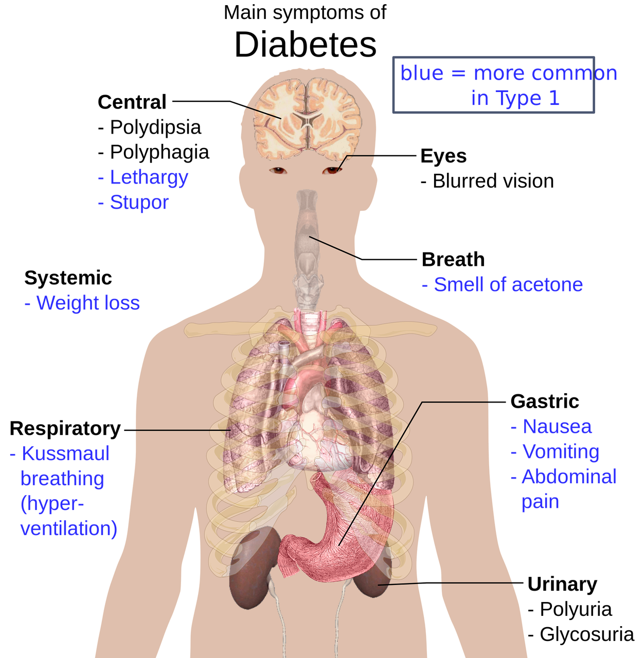 | 증상 | 갑작스럽게 나타남 고혈당 증상 (다뇨, 다음, 다식) 전신 쇠약감, 축 늘어짐, 두통 위장관 증상 (복통, 오심, 구토) Kussmaul 호흡 (아세톤 향) |