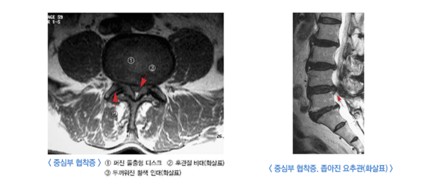 ∙ 중심성 척추 협착증은 황색 인대의 비후와 접힘 및 추간판의 팽윤으로 인해 척추관이 좁아져서 발생한다.