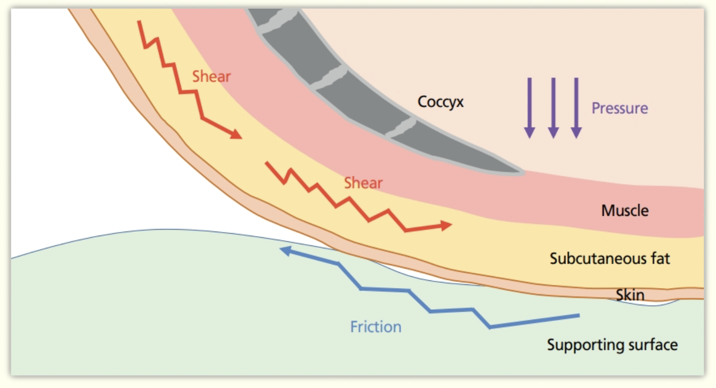 전단이란 조직에 수평으로 발생하는 물리적인 힘으로 환자가 아래로 밀려 내려가면 피부 안의 골격과 골격근에 부착된 조직은 밀려 내려가지만 피부는 그대로 움직이지 않은 상태가 된다. 이러한 전단력에 의해 하부 조직의 잠식이 심하게 발생할 수 있다.